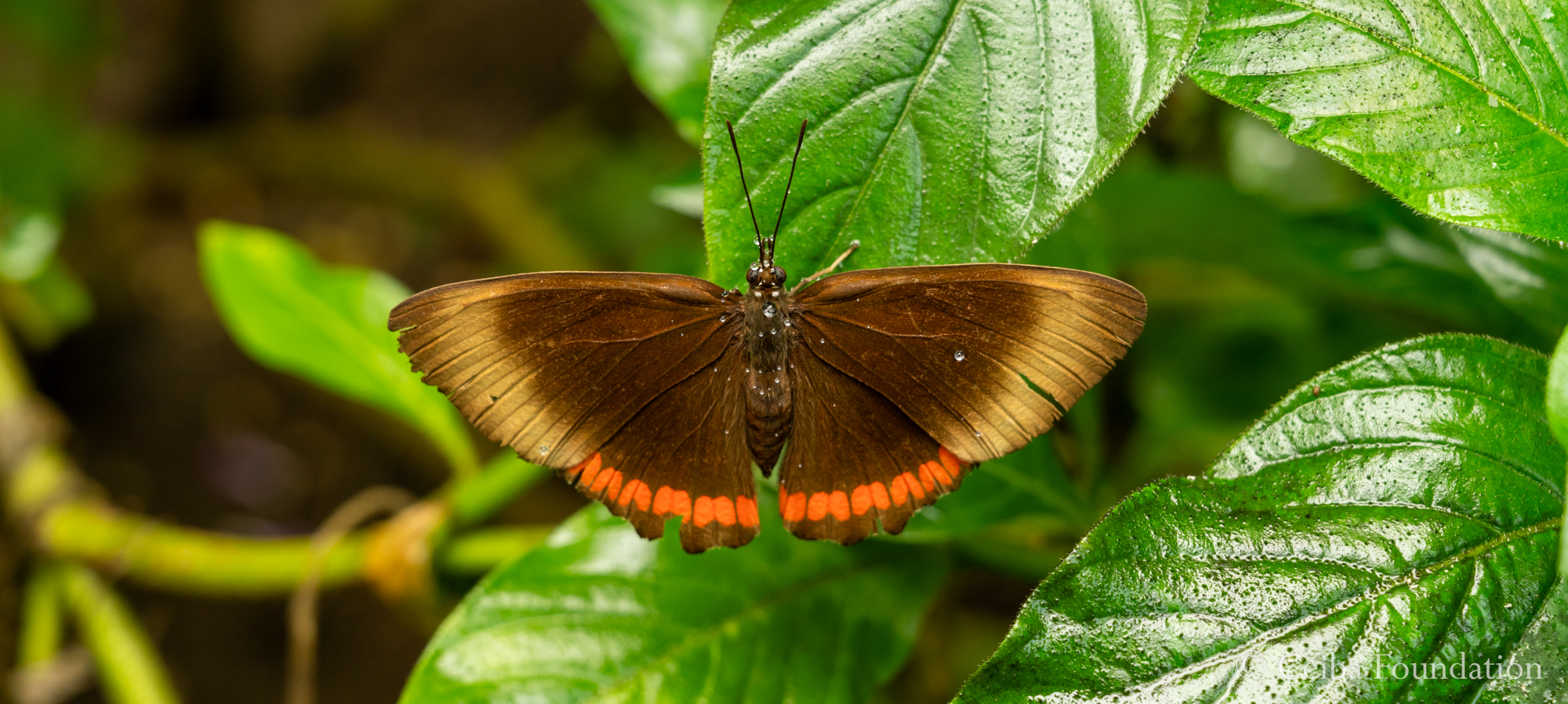 To keep the plants happy and the air humid, the garden is treated to regular showers from an overhead sprinkler system. Here a Red Rim Butterfly (Biblis sp.) still sports a few glittering drops of water.