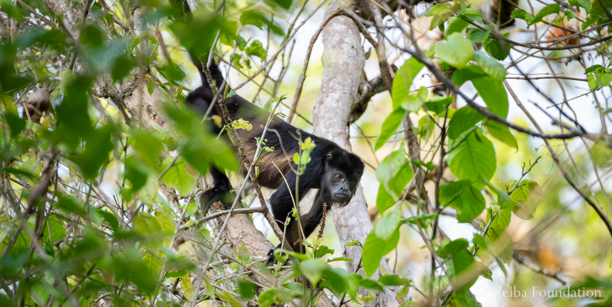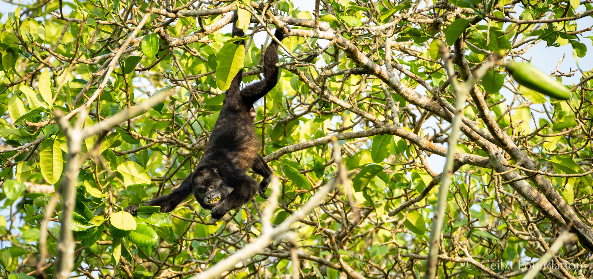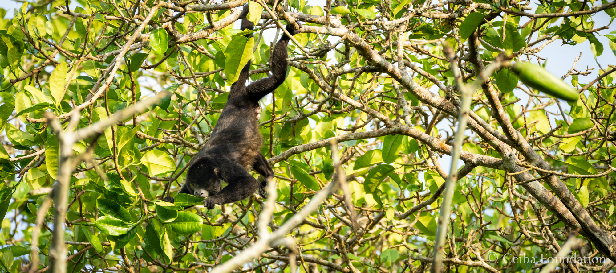 On the other side of the stream, in a Brosimum tree (close relative of a fig), this enterprising male uses his prehensile tail to dangle down to a particularly tasty cluster of leaves