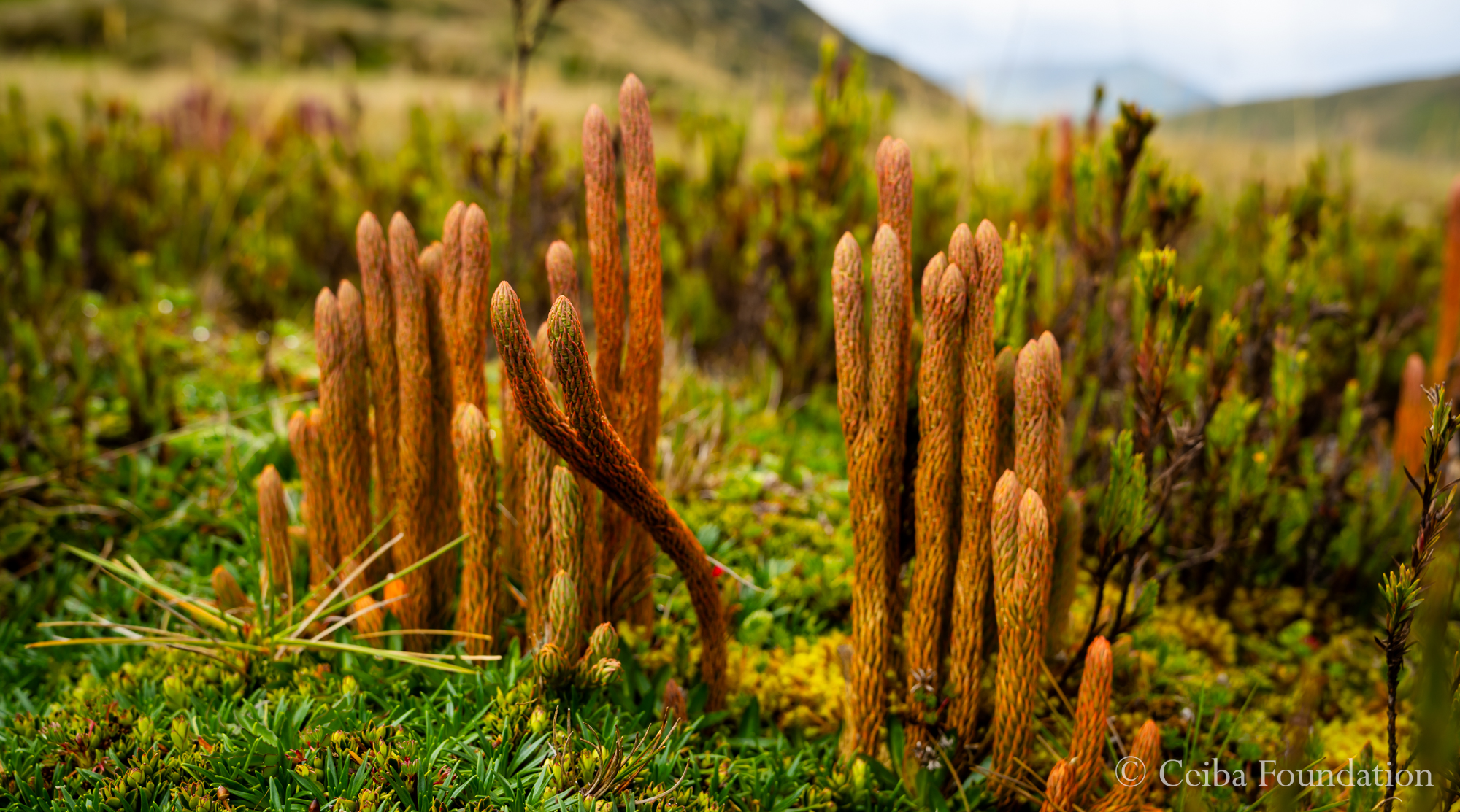 At this elevation, obscure plants thrive, hugging the ground to stay warm and protected from mountain winds. Here, a small cluster of Lycopodium overlook the high mountains.